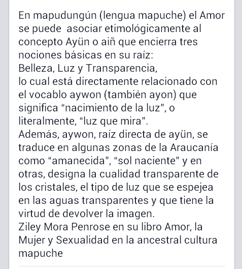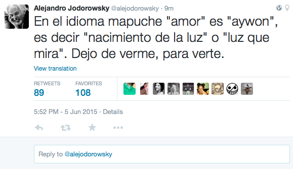 El asunto se vuelve un círculo vicioso cuando otros escritores toman estas afirmaciones como verdaderas y las reproducen en sus libros sin ningún tipo de verificación, por ejemplo, cuando Gastón Soublette da una interpretación bastante extraña de la etimología de la palabra wentru (hombre) en mapuche. Y quien está detrás de ese tollo esa supuesta etimología es –como era de esperar– Ziley Mora. Luego de eso se validan mutuamente, y la desinformación queda fijada como si fuera un hecho comprobado. Y luego se publican y republican por periodistas copiones y poco cautos, que no son capaces de sentarse cinco minutos a verificar la veracidad de lo que publican (y para eso estudian cinco años). En la era de la (des)información, parece ser más importante publicar cualquier tontera lo más rápido posible para juntar la mayor cantidad de clicks, falso trofeo del éxito periodístico. Explicaré el fenómeno de la validación mutua con un ejemplo real. No le pasó al amigo de un amigo, sino a mí mismo hace unos días. Me topé en el twitter de Alejandro Jodorowsky con una supuesta palabra mapuche, aywon, que significaría “nacimiento de luz” o “luz que mira”.