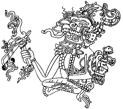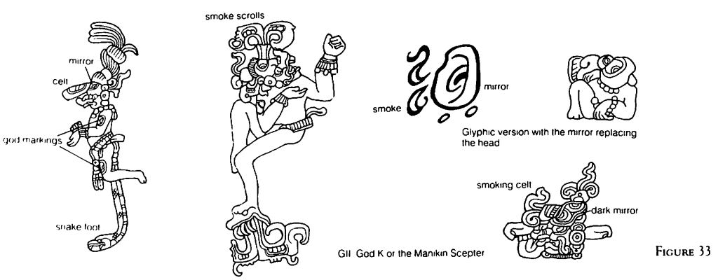 Sin embargo, tal juego de palabras no es posible en náhuatl, lo cual sugiere que el nombre náhuatl Tezcatlipoca, cuyo significado es “espejo humeante”, podría tener una imagen maya detrás. Como dios, Tezcatlipoca es de una sola pierna y causante de huracanes (Hunt 1977:241-42).