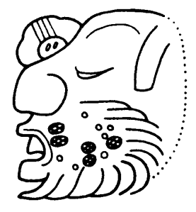 Glifo de nombre clásico del gemelo de la diadema manchada, detalle de un cuenco del periodo clásico tardío. (Ilustración de Taube 1992:116)