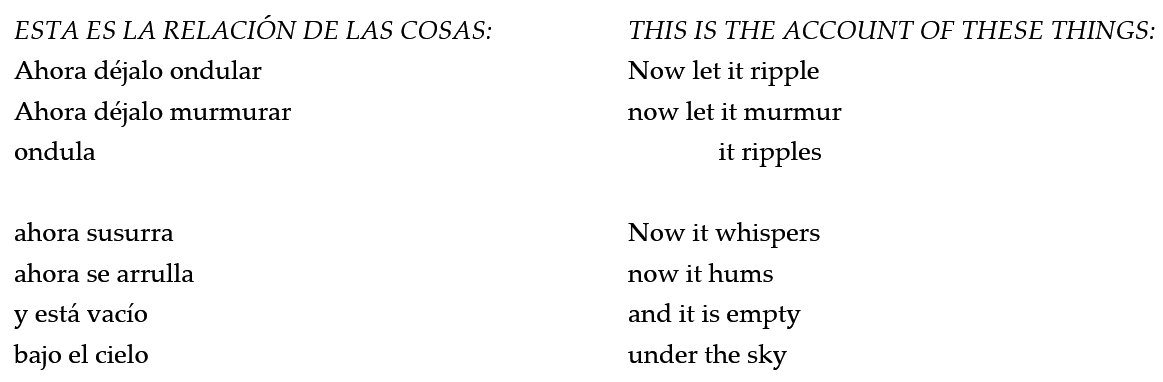 [2] Otros traductores, incluyendo a Edmonson, han cometido tres errores en este pasaje: 1) ellos omiten la fuerza imperativa del sufijo –oq en katz’ininoq y kachamamoq; 2) interpretan el pasaje en tiempo pasado, mientras que a los verbos les falta el prefijo x– ; 3) traducen los primeros cinco verbos de los dos tercetos como refiriéndose simplemente al silencio, mientras que cada uno de estos verbos y especialmente los aliterados (tz’inin, chamam, lolin) describen una quietud donde solo se escuchan muy leves y pulsátiles sonidos (como el sonido de los insectos o el agua). El narrador al usar el sufijo –oq, el prefijo de tiempo presente y los verbos onomatopéyicos, representa la creación para su audiencia, en lugar de simplemente describir eventos ya sucedidos.