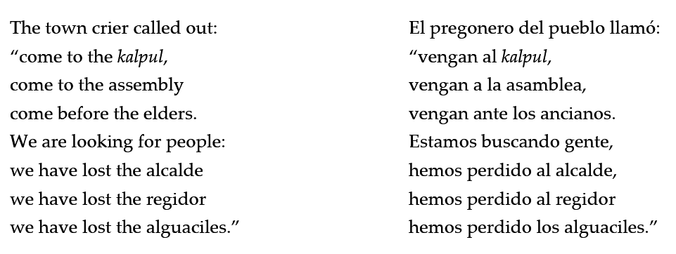 Hasta ahora hemos colocado unidades paralelas una debajo de la otra, lo que ciertamente muestra su construcción sintáctica, pero las grabaciones de expresiones orales actuales sugieren un enfoque diferente (ver D. Tedlock 1971). Efectuando cambios de línea de acuerdo con la consonancia de las pausas reales de los hablantes, obtenemos los resultados siguientes: